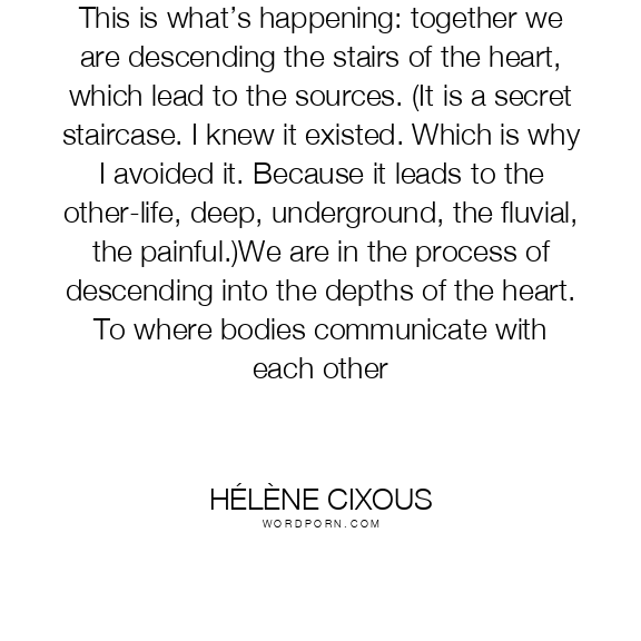 This is what’s happening: together we are descending the stairs of the heart, which lead to the sources. (It is a secret staircase. I knew it existed. Which is why I avoided it. Because it leads to the other-life, deep, underground, the fluvial, the painful.)We are in the process of descending into the depths of the heart. To where bodies communicate with each other