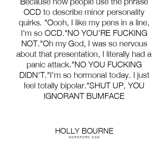Because now people use the phrase OCD to describe minor personality quirks. "Oooh, I like my pens in a line, I'm so OCD."NO YOU'RE FUCKING NOT."Oh my God, I was so nervous about that presentation, I literally had a panic attack."NO YOU FUCKING DIDN'T."I'm so hormonal today. I just feel totally bipolar."SHUT UP, YOU IGNORANT BUMFACE