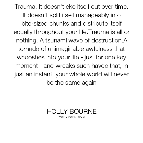 Trauma. It doesn't eke itself out over time. It doesn't split itself manageably into bite-sized chunks and distribute itself equally throughout your life.Trauma is all or nothing. A tsunami wave of destruction.A tornado of unimaginable awfulness that whooshes into your life - just for one key moment - and wreaks such havoc that, in just an instant, your whole world will never be the same again
