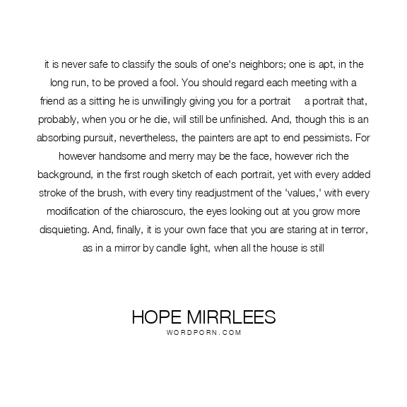 it is never safe to classify the souls of one's neighbors; one is apt, in the long run, to be proved a fool. You should regard each meeting with a friend as a sitting he is unwillingly giving you for a portrait -- a portrait that, probably, when you or he die, will still be unfinished. And, though this is an absorbing pursuit, nevertheless, the painters are apt to end pessimists. For however handsome and merry may be the face, however rich the background, in the first rough sketch of each portrait, yet with every added stroke of the brush, with every tiny readjustment of the 'values,' with every modification of the chiaroscuro, the eyes looking out at you grow more disquieting. And, finally, it is your own face that you are staring at in terror, as in a mirror by candle-light, when all the house is still