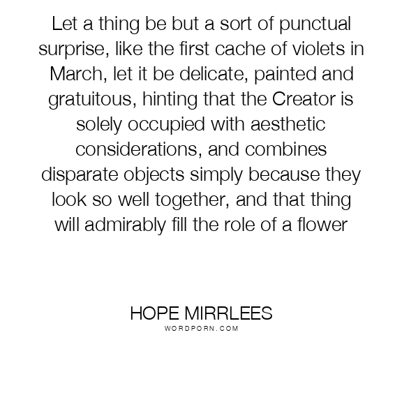 Let a thing be but a sort of punctual surprise, like the first cache of violets in March, let it be delicate, painted and gratuitous, hinting that the Creator is solely occupied with aesthetic considerations, and combines disparate objects simply because they look so well together, and that thing will admirably fill the role of a flower