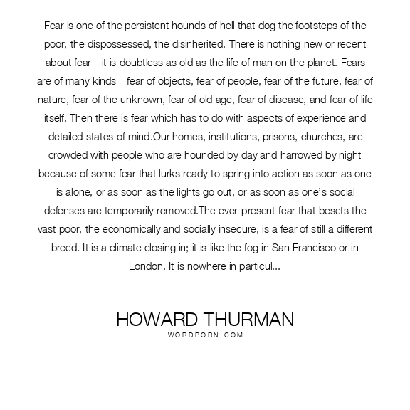 Fear is one of the persistent hounds of hell that dog the footsteps of the poor, the dispossessed, the disinherited. There is nothing new or recent about fear—it is doubtless as old as the life of man on the planet. Fears are of many kinds—fear of objects, fear of people, fear of the future, fear of nature, fear of the unknown, fear of old age, fear of disease, and fear of life itself. Then there is fear which has to do with aspects of experience and detailed states of mind.Our homes, institutions, prisons, churches, are crowded with people who are hounded by day and harrowed by night because of some fear that lurks ready to spring into action as soon as one is alone, or as soon as the lights go out, or as soon as one’s social defenses are temporarily removed.The ever-present fear that besets the vast poor, the economically and socially insecure, is a fear of still a different breed. It is a climate closing in; it is like the fog in San Francisco or in London. It is nowhere in particular yet everywhere. It is a mood which one carries around with himself, distilled from the acrid conflict with which his days are surrounded. It has its roots deep in the heart of the relations between the weak and the strong, between the controllers of environment and those who are controlled by it.When the basis of such fear is analyzed, it is clear that it arises out of the sense of isolation and helplessness in the face of the varied dimensions of violence to which the underprivileged are exposed. Violence, precipitate and stark, is the sire of the fear of such people. It is spawned by the perpetual threat of violence everywhere. Of course, physical violence is the most obvious cause. But here, it is important to point out, a particular kind of physical violence or its counterpart is evidenced; it is violence that is devoid of the element of contest. It is what is feared by the rabbit that cannot ultimately escape the hounds