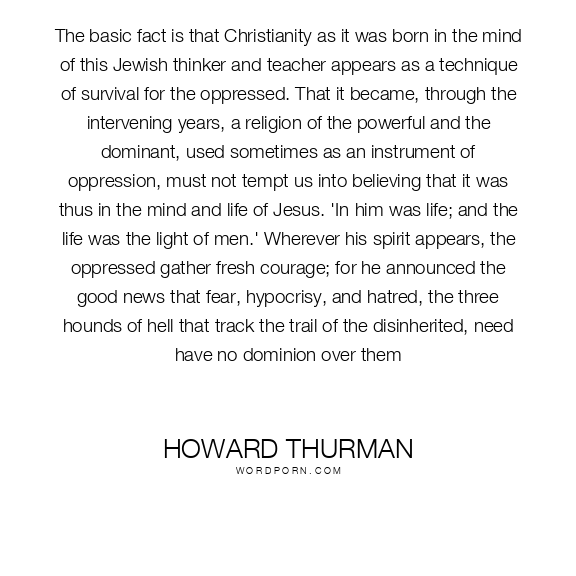 The basic fact is that Christianity as it was born in the mind of this Jewish thinker and teacher appears as a technique of survival for the oppressed. That it became, through the intervening years, a religion of the powerful and the dominant, used sometimes as an instrument of oppression, must not tempt us into believing that it was thus in the mind and life of Jesus. 'In him was life; and the life was the light of men.' Wherever his spirit appears, the oppressed gather fresh courage; for he announced the good news that fear, hypocrisy, and hatred, the three hounds of hell that track the trail of the disinherited, need have no dominion over them