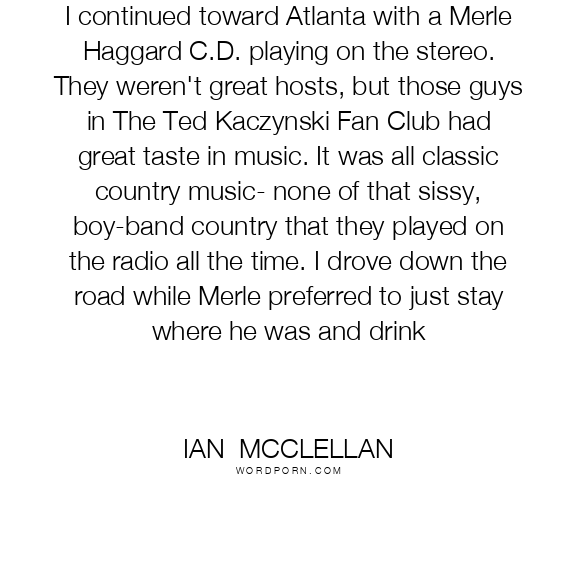 I continued toward Atlanta with a Merle Haggard C.D. playing on the stereo. They weren't great hosts, but those guys in The Ted Kaczynski Fan Club had great taste in music. It was all classic country music- none of that sissy, boy-band country that they played on the radio all the time. I drove down the road while Merle preferred to just stay where he was and drink