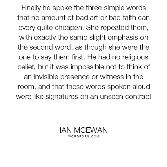 Finally he spoke the three simple words that no amount of bad art or bad faith can every quite cheapen. She repeated them, with exactly the same slight emphasis on the second word, as though she were the one to say them first. He had no religious belief, but it was impossible not to think of an invisible presence or witness in the room, and that these words spoken aloud were like signatures on an unseen contract