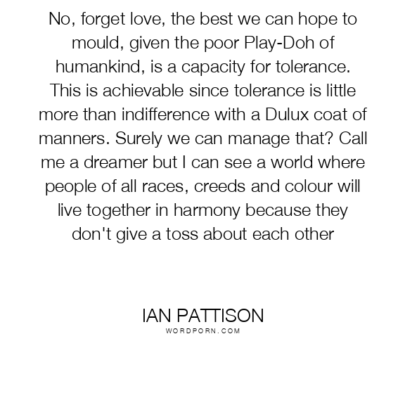 No, forget love, the best we can hope to mould, given the poor Play-Doh of humankind, is a capacity for tolerance. This is achievable since tolerance is little more than indifference with a Dulux coat of manners. Surely we can manage that? Call me a dreamer but I can see a world where people of all races, creeds and colour will live together in harmony because they don't give a toss about each other