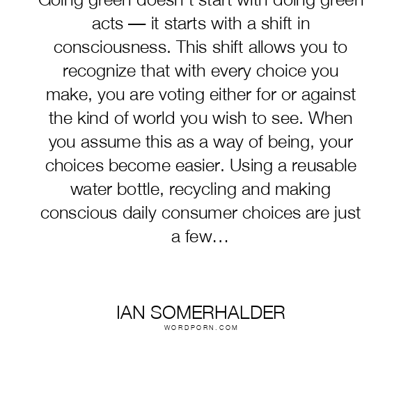 Going green doesn’t start with doing green acts — it starts with a shift in consciousness. This shift allows you to recognize that with every choice you make, you are voting either for or against the kind of world you wish to see. When you assume this as a way of being, your choices become easier. Using a reusable water bottle, recycling and making conscious daily consumer choices are just a few…