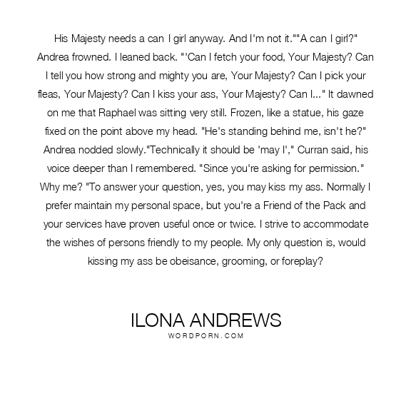 His Majesty needs a can-I girl anyway. And I'm not it.""A can-I girl?" Andrea frowned. I leaned back. "'Can I fetch your food, Your Majesty? Can I tell you how strong and mighty you are, Your Majesty? Can I pick your fleas, Your Majesty? Can I kiss your ass, Your Majesty? Can I..." It dawned on me that Raphael was sitting very still. Frozen, like a statue, his gaze fixed on the point above my head. "He's standing behind me, isn't he?" Andrea nodded slowly."Technically it should be 'may I'," Curran said, his voice deeper than I remembered. "Since you're asking for permission." Why me? "To answer your question, yes, you may kiss my ass. Normally I prefer maintain my personal space, but you're a Friend of the Pack and your services have proven useful once or twice. I strive to accommodate the wishes of persons friendly to my people. My only question is, would kissing my ass be obeisance, grooming, or foreplay?