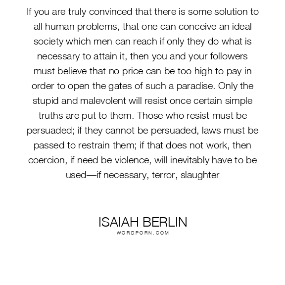 If you are truly convinced that there is some solution to all human problems, that one can conceive an ideal society which men can reach if only they do what is necessary to attain it, then you and your followers must believe that no price can be too high to pay in order to open the gates of such a paradise. Only the stupid and malevolent will resist once certain simple truths are put to them. Those who resist must be persuaded; if they cannot be persuaded, laws must be passed to restrain them; if that does not work, then coercion, if need be violence, will inevitably have to be used—if necessary, terror, slaughter