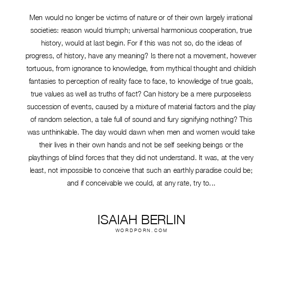 Men would no longer be victims of nature or of their own largely irrational societies: reason would triumph; universal harmonious cooperation, true history, would at last begin. For if this was not so, do the ideas of progress, of history, have any meaning? Is there not a movement, however tortuous, from ignorance to knowledge, from mythical thought and childish fantasies to perception of reality face to face, to knowledge of true goals, true values as well as truths of fact? Can history be a mere purposeless succession of events, caused by a mixture of material factors and the play of random selection, a tale full of sound and fury signifying nothing? This was unthinkable. The day would dawn when men and women would take their lives in their own hands and not be self-seeking beings or the playthings of blind forces that they did not understand. It was, at the very least, not impossible to conceive that such an earthly paradise could be; and if conceivable we could, at any rate, try to march towards it. That has been at the centre of ethical thought from the Greeks to the Christian visionaries of the Middle Ages, from the Renaissance to progressive thought in the last century; and indeed, is believed by many to this day