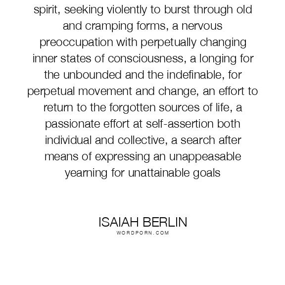 Romanticism embodied "a new and restless spirit, seeking violently to burst through old and cramping forms, a nervous preoccupation with perpetually changing inner states of consciousness, a longing for the unbounded and the indefinable, for perpetual movement and change, an effort to return to the forgotten sources of life, a passionate effort at self-assertion both individual and collective, a search after means of expressing an unappeasable yearning for unattainable goals