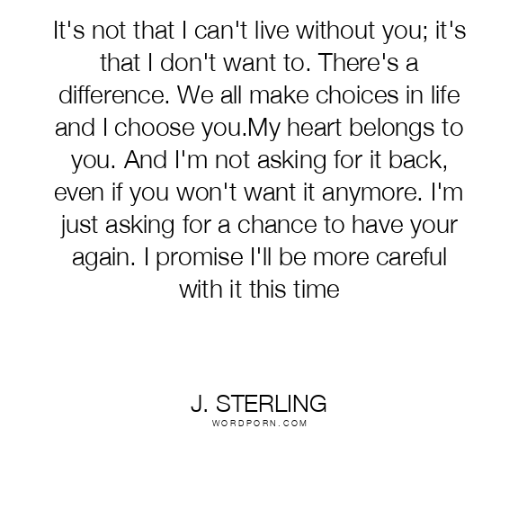 It's not that I can't live without you; it's that I don't want to. There's a difference. We all make choices in life and I choose you.My heart belongs to you. And I'm not asking for it back, even if you won't want it anymore. I'm just asking for a chance to have your again. I promise I'll be more careful with it this time