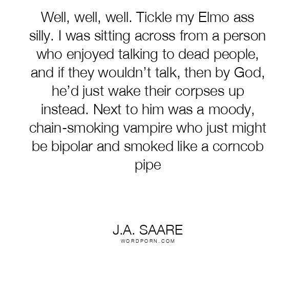 Well, well, well. Tickle my Elmo ass silly. I was sitting across from a person who enjoyed talking to dead people, and if they wouldn’t talk, then by God, he’d just wake their corpses up instead. Next to him was a moody, chain-smoking vampire who just might be bipolar and smoked like a corncob pipe