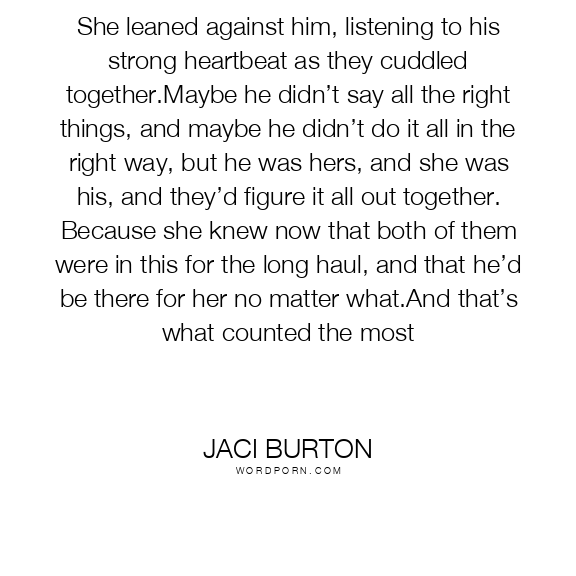 Jaci Burton quote. She leaned against him, listening to his strong heartbeat as they cuddled together.Maybe he didn’t say all the right things, and maybe he didn’t do it all in the right way, but he was hers, and she was his, and they’d figure it all out together. Because she knew now that both of them were in this for the long haul, and that he’d be there for her no matter what.And that’s what counted the most