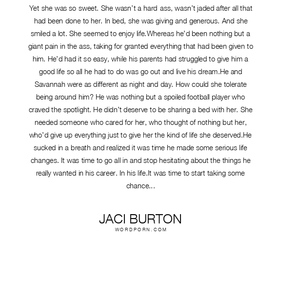Jaci Burton quote. Yet she was so sweet. She wasn’t a hard-ass, wasn’t jaded after all that had been done to her. In bed, she was giving and generous. And she smiled a lot. She seemed to enjoy life.Whereas he’d been nothing but a giant pain in the ass, taking for granted everything that had been given to him. He’d had it so easy, while his parents had struggled to give him a good life so all he had to do was go out and live his dream.He and Savannah were as different as night and day. How could she tolerate being around him? He was nothing but a spoiled football player who craved the spotlight. He didn’t deserve to be sharing a bed with her. She needed someone who cared for her, who thought of nothing but her, who’d give up everything just to give her the kind of life she deserved.He sucked in a breath and realized it was time he made some serious life changes. It was time to go all in and stop hesitating about the things he really wanted in his career. In his life.It was time to start taking some chances