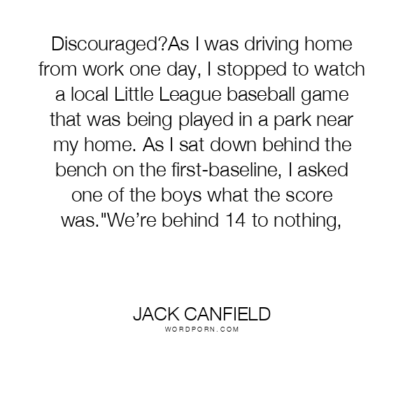 Discouraged?As I was driving home from work one day, I stopped to watch a local Little League baseball game that was being played in a park near my home. As I sat down behind the bench on the first-baseline, I asked one of the boys what the score was."We’re behind 14 to nothing,