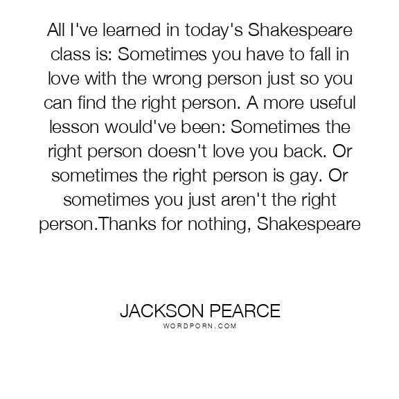 All I've learned in today's Shakespeare class is: Sometimes you have to fall in love with the wrong person just so you can find the right person. A more useful lesson would've been: Sometimes the right person doesn't love you back. Or sometimes the right person is gay. Or sometimes you just aren't the right person.Thanks for nothing, Shakespeare