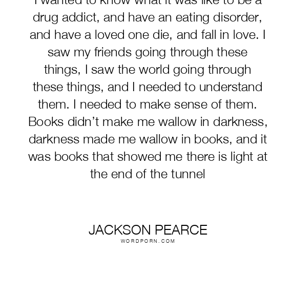 I wanted to know what it was like to be a drug addict, and have an eating disorder, and have a loved one die, and fall in love. I saw my friends going through these things, I saw the world going through these things, and I needed to understand them. I needed to make sense of them. Books didn’t make me wallow in darkness, darkness made me wallow in books, and it was books that showed me there is light at the end of the tunnel