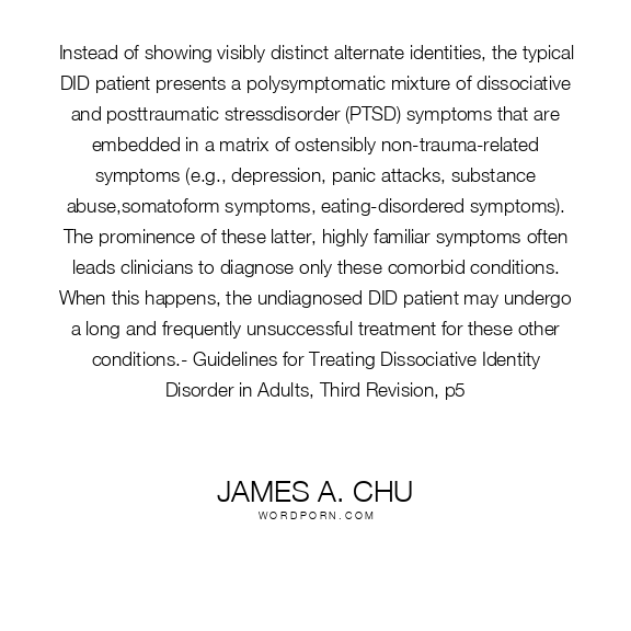 Instead of showing visibly distinct alternate identities, the typical DID patient presents a polysymptomatic mixture of dissociative and posttraumatic stressdisorder (PTSD) symptoms that are embedded in a matrix of ostensibly non-trauma-related symptoms (e.g., depression, panic attacks, substance abuse,somatoform symptoms, eating-disordered symptoms). The prominence of these latter, highly familiar symptoms often leads clinicians to diagnose only these comorbid conditions. When this happens, the undiagnosed DID patient may undergo a long and frequently unsuccessful treatment for these other conditions.- Guidelines for Treating Dissociative Identity Disorder in Adults, Third Revision, p5