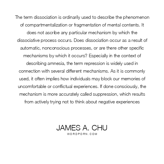 The term dissociation is ordinarily used to describe the phenomenon of compartmentalization or fragmentation of mental contents. It does not ascribe any particular mechanism by which the dissociative process occurs. Does dissociation occur as a result of automatic, nonconscious processes, or are there other specific mechanisms by which it occurs? Especially in the context of describing amnesia, the term repression is widely used in connection with several different mechanisms. As it is commonly used, it often implies how individuals may block our memories of uncomfortable or conflictual experiences. If done consciously, the mechanism is more accurately called suppression, which results from actively trying not to think about negative experiences