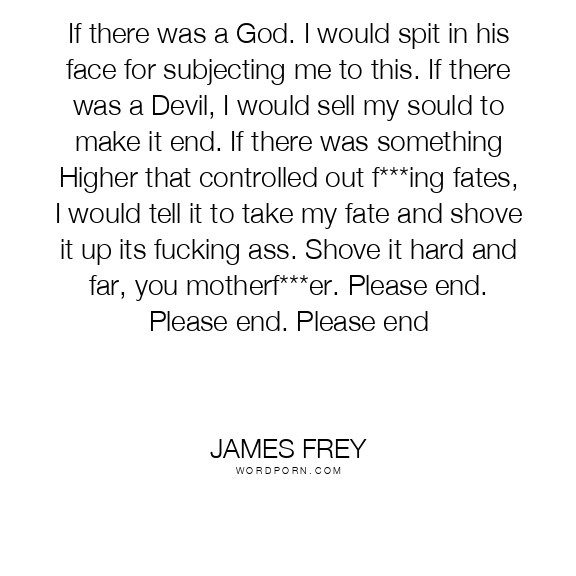If there was a God. I would spit in his face for subjecting me to this. If there was a Devil, I would sell my sould to make it end. If there was something Higher that controlled out f***ing fates, I would tell it to take my fate and shove it up its fucking ass. Shove it hard and far, you motherf***er. Please end. Please end. Please end