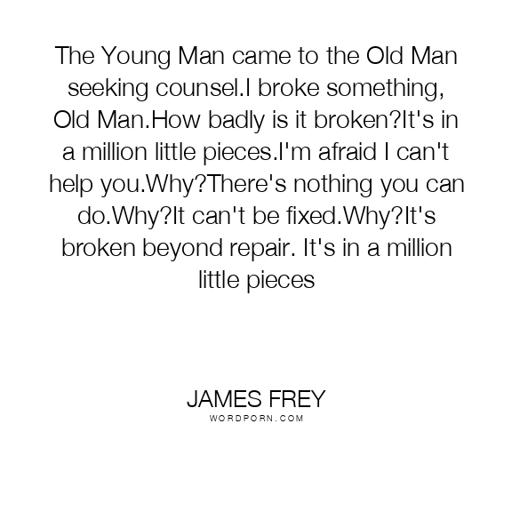 The Young Man came to the Old Man seeking counsel.I broke something, Old Man.How badly is it broken?It's in a million little pieces.I'm afraid I can't help you.Why?There's nothing you can do.Why?It can't be fixed.Why?It's broken beyond repair. It's in a million little pieces
