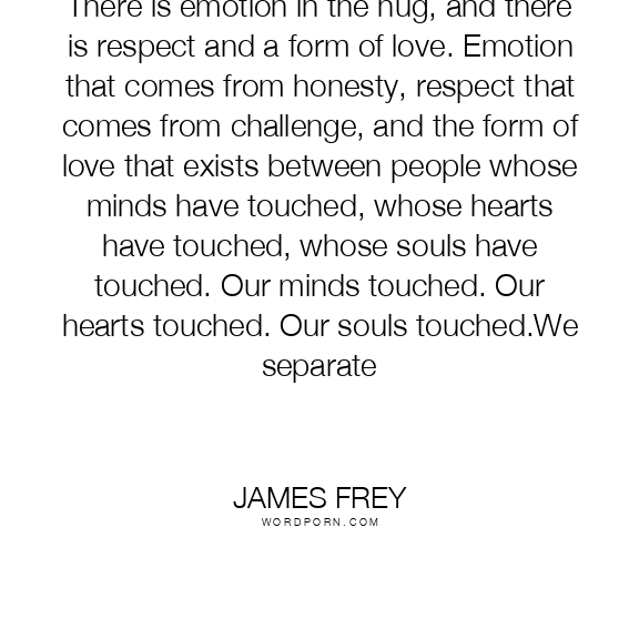 There is emotion in the hug, and there is respect and a form of love. Emotion that comes from honesty, respect that comes from challenge, and the form of love that exists between people whose minds have touched, whose hearts have touched, whose souls have touched. Our minds touched. Our hearts touched. Our souls touched.We separate