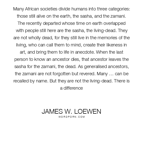 Many African societies divide humans into three categories: those still alive on the earth, the sasha, and the zamani. The recently departed whose time on earth overlapped with people still here are the sasha, the living-dead. They are not wholly dead, for they still live in the memories of the living, who can call them to mind, create their likeness in art, and bring them to life in anecdote. When the last person to know an ancestor dies, that ancestor leaves the sasha for the zamani, the dead. As generalised ancestors, the zamani are not forgotten but revered. Many … can be recalled by name. But they are not the living-dead. There is a difference