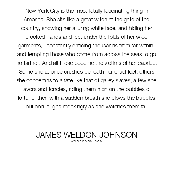 New York City is the most fatally fascinating thing in America. She sits like a great witch at the gate of the country, showing her alluring white face, and hiding her crooked hands and feet under the folds of her wide garments,--constantly enticing thousands from far within, and tempting those who come from across the seas to go no farther. And all these become the victims of her caprice. Some she at once crushes beneath her cruel feet; others she condemns to a fate like that of galley slaves; a few she favors and fondles, riding them high on the bubbles of fortune; then with a sudden breath she blows the bubbles out and laughs mockingly as she watches them fall