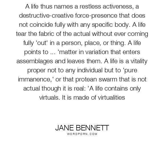 A life thus names a restless activeness, a destructive-creative force-presence that does not coincide fully with any specific body. A life tear the fabric of the actual without ever coming fully 'out' in a person, place, or thing. A life points to ... 'matter in variation that enters assemblages and leaves them. A life is a vitality proper not to any individual but to 'pure immanence,' or that protean swarm that is not actual though it is real: 'A life contains only virtuals. It is made of virtualities