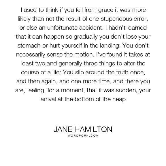 I used to think if you fell from grace it was more likely than not the result of one stupendous error, or else an unfortunate accident. I hadn't learned that it can happen so gradually you don't lose your stomach or hurt yourself in the landing. You don't necessarily sense the motion. I've found it takes at least two and generally three things to alter the course of a life: You slip around the truth once, and then again, and one more time, and there you are, feeling, for a moment, that it was sudden, your arrival at the bottom of the heap