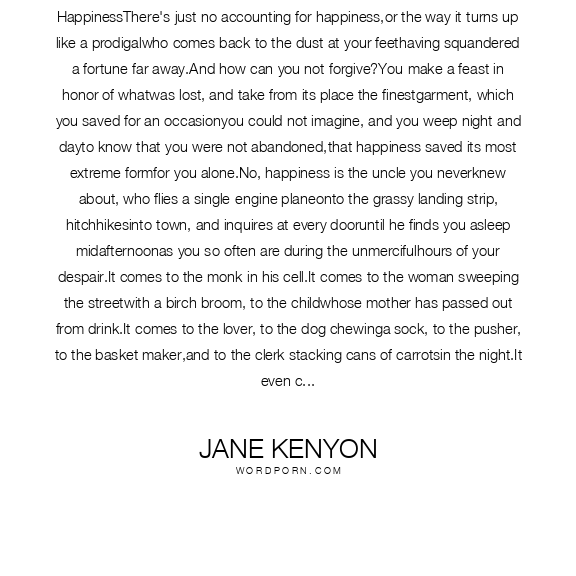 HappinessThere's just no accounting for happiness,or the way it turns up like a prodigalwho comes back to the dust at your feethaving squandered a fortune far away.And how can you not forgive?You make a feast in honor of whatwas lost, and take from its place the finestgarment, which you saved for an occasionyou could not imagine, and you weep night and dayto know that you were not abandoned,that happiness saved its most extreme formfor you alone.No, happiness is the uncle you neverknew about, who flies a single-engine planeonto the grassy landing strip, hitchhikesinto town, and inquires at every dooruntil he finds you asleep midafternoonas you so often are during the unmercifulhours of your despair.It comes to the monk in his cell.It comes to the woman sweeping the streetwith a birch broom, to the childwhose mother has passed out from drink.It comes to the lover, to the dog chewinga sock, to the pusher, to the basket maker,and to the clerk stacking cans of carrotsin the night.It even comes to the boulderin the perpetual shade of pine barrens,to rain falling on the open sea,to the wineglass, weary of holding wine
