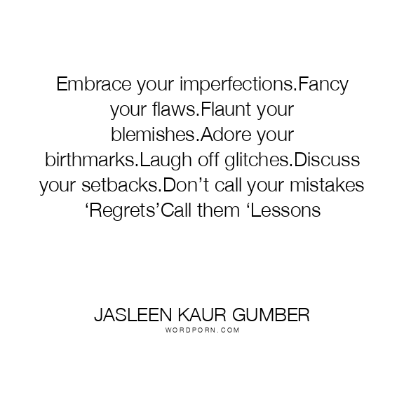 Embrace your imperfections.Fancy your flaws.Flaunt your blemishes.Adore your birthmarks.Laugh off glitches.Discuss your setbacks.Don’t call your mistakes ‘Regrets’Call them ‘Lessons