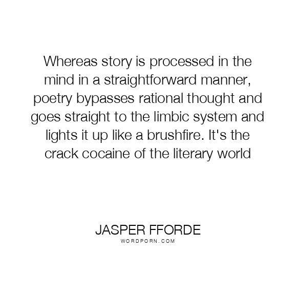 Whereas story is processed in the mind in a straightforward manner, poetry bypasses rational thought and goes straight to the limbic system and lights it up like a brushfire. It's the crack cocaine of the literary world