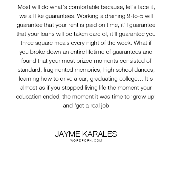 Most will do what’s comfortable because, let’s face it, we all like guarantees. Working a draining 9-to-5 will guarantee that your rent is paid on time, it’ll guarantee that your loans will be taken care of, it’ll guarantee you three square meals every night of the week. What if you broke down an entire lifetime of guarantees and found that your most prized moments consisted of standard, fragmented memories; high school dances, learning how to drive a car, graduating college… It’s almost as if you stopped living life the moment your education ended, the moment it was time to ‘grow up’ and ‘get a real job