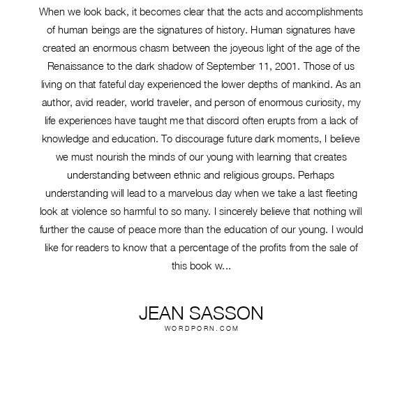When we look back, it becomes clear that the acts and accomplishments of human beings are the signatures of history. Human signatures have created an enormous chasm between the joyeous light of the age of the Renaissance to the dark shadow of September 11, 2001. Those of us living on that fateful day experienced the lower depths of mankind. As an author, avid reader, world traveler, and person of enormous curiosity, my life experiences have taught me that discord often erupts from a lack of knowledge and education. To discourage future dark moments, I believe we must nourish the minds of our young with learning that creates understanding between ethnic and religious groups. Perhaps understanding will lead to a marvelous day when we take a last fleeting look at violence so harmful to so many. I sincerely believe that nothing will further the cause of peace more than the education of our young. I would like for readers to know that a percentage of the profits from the sale of this book will be devoted to the cause of education.May all roads lead to peace