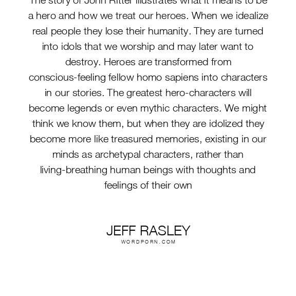 The story of John Ritter illustrates what it means to be a hero and how we treat our heroes. When we idealize real people they lose their humanity. They are turned into idols that we worship and may later want to destroy. Heroes are transformed from conscious-feeling fellow homo sapiens into characters in our stories. The greatest hero-characters will become legends or even mythic characters. We might think we know them, but when they are idolized they become more like treasured memories, existing in our minds as archetypal characters, rather than living-breathing human beings with thoughts and feelings of their own