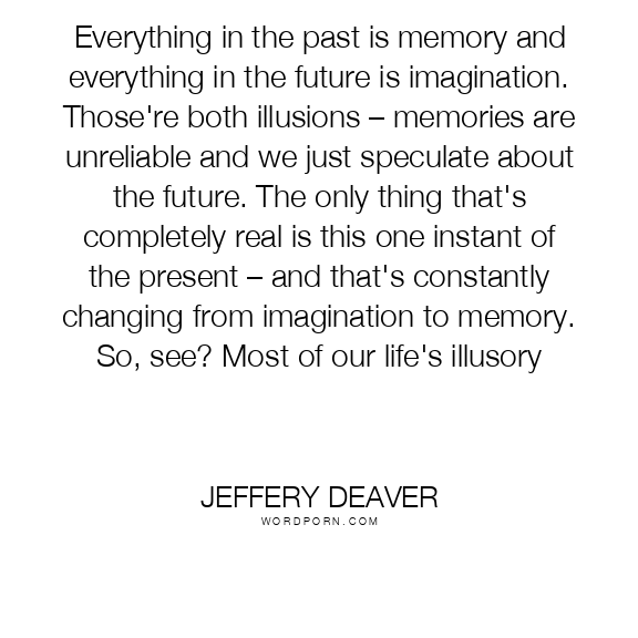 Everything in the past is memory and everything in the future is imagination. Those're both illusions – memories are unreliable and we just speculate about the future. The only thing that's completely real is this one instant of the present – and that's constantly changing from imagination to memory. So, see? Most of our life's illusory