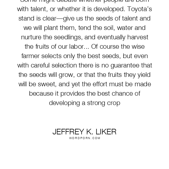 Some might debate whether people are born with talent, or whether it is developed. Toyota’s stand is clear—give us the seeds of talent and we will plant them, tend the soil, water and nurture the seedlings, and eventually harvest the fruits of our labor... Of course the wise farmer selects only the best seeds, but even with careful selection there is no guarantee that the seeds will grow, or that the fruits they yield will be sweet, and yet the effort must be made because it provides the best chance of developing a strong crop