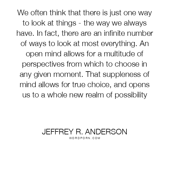 We often think that there is just one way to look at things - the way we always have. In fact, there are an infinite number of ways to look at most everything. An open mind allows for a multitude of perspectives from which to choose in any given moment. That suppleness of mind allows for true choice, and opens us to a whole new realm of possibility