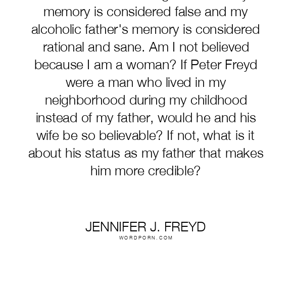Jennifer J. Freyd quote. At times I am flabbergasted that my memory is considered false and my alcoholic father's memory is considered rational and sane. Am I not believed because I am a woman? If Peter Freyd were a man who lived in my neighborhood during my childhood instead of my father, would he and his wife be so believable? If not, what is it about his status as my father that makes him more credible?