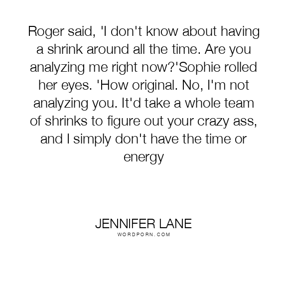 Roger said, 'I don't know about having a shrink around all the time. Are you analyzing me right now?'Sophie rolled her eyes. 'How original. No, I'm not analyzing you. It'd take a whole team of shrinks to figure out your crazy ass, and I simply don't have the time or energy