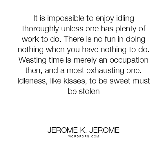 Jerome K. Jerome quote. It is impossible to enjoy idling thoroughly unless one has plenty of work to do. There is no fun in doing nothing when you have nothing to do. Wasting time is merely an occupation then, and a most exhausting one. Idleness, like kisses, to be sweet must be stolen