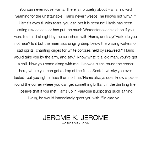 Jerome K. Jerome quote. You can never rouse Harris. There is no poetry about Harris- no wild yearning for the unattainable. Harris never