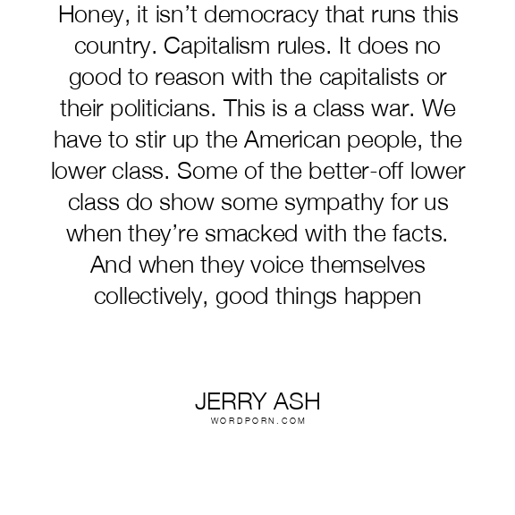 Honey, it isn’t democracy that runs this country. Capitalism rules. It does no good to reason with the capitalists or their politicians. This is a class war. We have to stir up the American people, the lower class. Some of the better-off lower class do show some sympathy for us when they’re smacked with the facts. And when they voice themselves collectively, good things happen