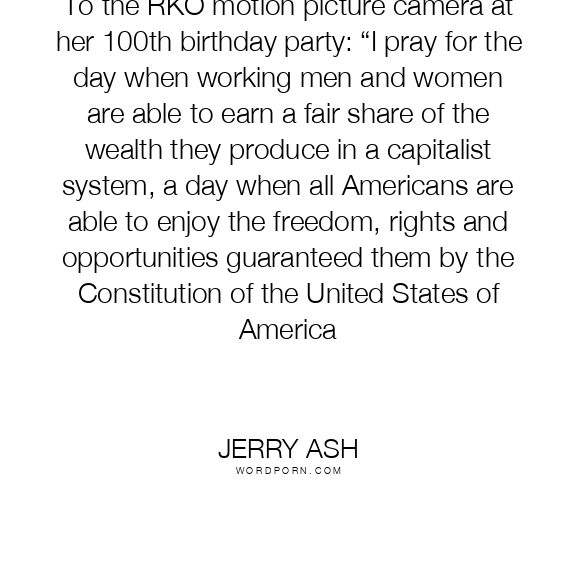 To the RKO motion picture camera at her 100th birthday party: “I pray for the day when working men and women are able to earn a fair share of the wealth they produce in a capitalist system, a day when all Americans are able to enjoy the freedom, rights and opportunities guaranteed them by the Constitution of the United States of America