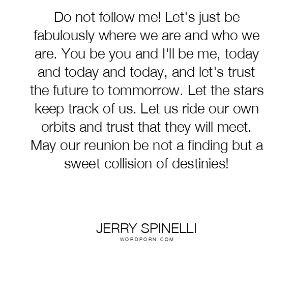 Do not follow me! Let's just be fabulously where we are and who we are. You be you and I'll be me, today and today and today, and let's trust the future to tommorrow. Let the stars keep track of us. Let us ride our own orbits and trust that they will meet. May our reunion be not a finding but a sweet collision of destinies!