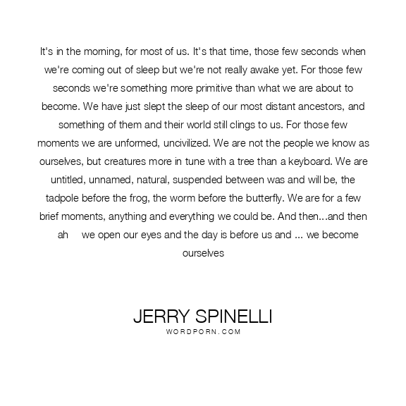 It's in the morning, for most of us. It's that time, those few seconds when we're coming out of sleep but we're not really awake yet. For those few seconds we're something more primitive than what we are about to become. We have just slept the sleep of our most distant ancestors, and something of them and their world still clings to us. For those few moments we are unformed, uncivilized. We are not the people we know as ourselves, but creatures more in tune with a tree than a keyboard. We are untitled, unnamed, natural, suspended between was and will be, the tadpole before the frog, the worm before the butterfly. We are for a few brief moments, anything and everything we could be. And then...and then -- ah -- we open our eyes and the day is before us and ... we become ourselves