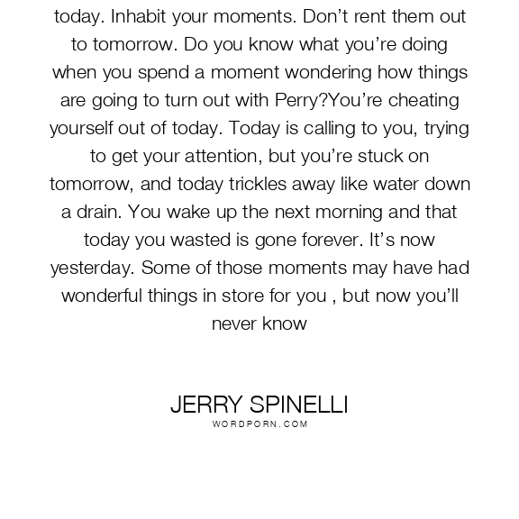 Live today. Not yesterday. Not tomorrow. Just today. Inhabit your moments. Don’t rent them out to tomorrow. Do you know what you’re doing when you spend a moment wondering how things are going to turn out with Perry?You’re cheating yourself out of today. Today is calling to you, trying to get your attention, but you’re stuck on tomorrow, and today trickles away like water down a drain. You wake up the next morning and that today you wasted is gone forever. It’s now yesterday. Some of those moments may have had wonderful things in store for you , but now you’ll never know