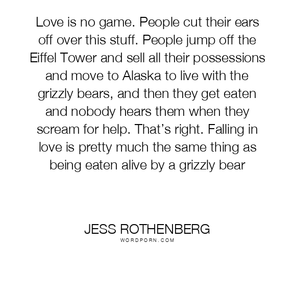 Love is no game. People cut their ears off over this stuff. People jump off the Eiffel Tower and sell all their possessions and move to Alaska to live with the grizzly bears, and then they get eaten and nobody hears them when they scream for help. That’s right. Falling in love is pretty much the same thing as being eaten alive by a grizzly bear